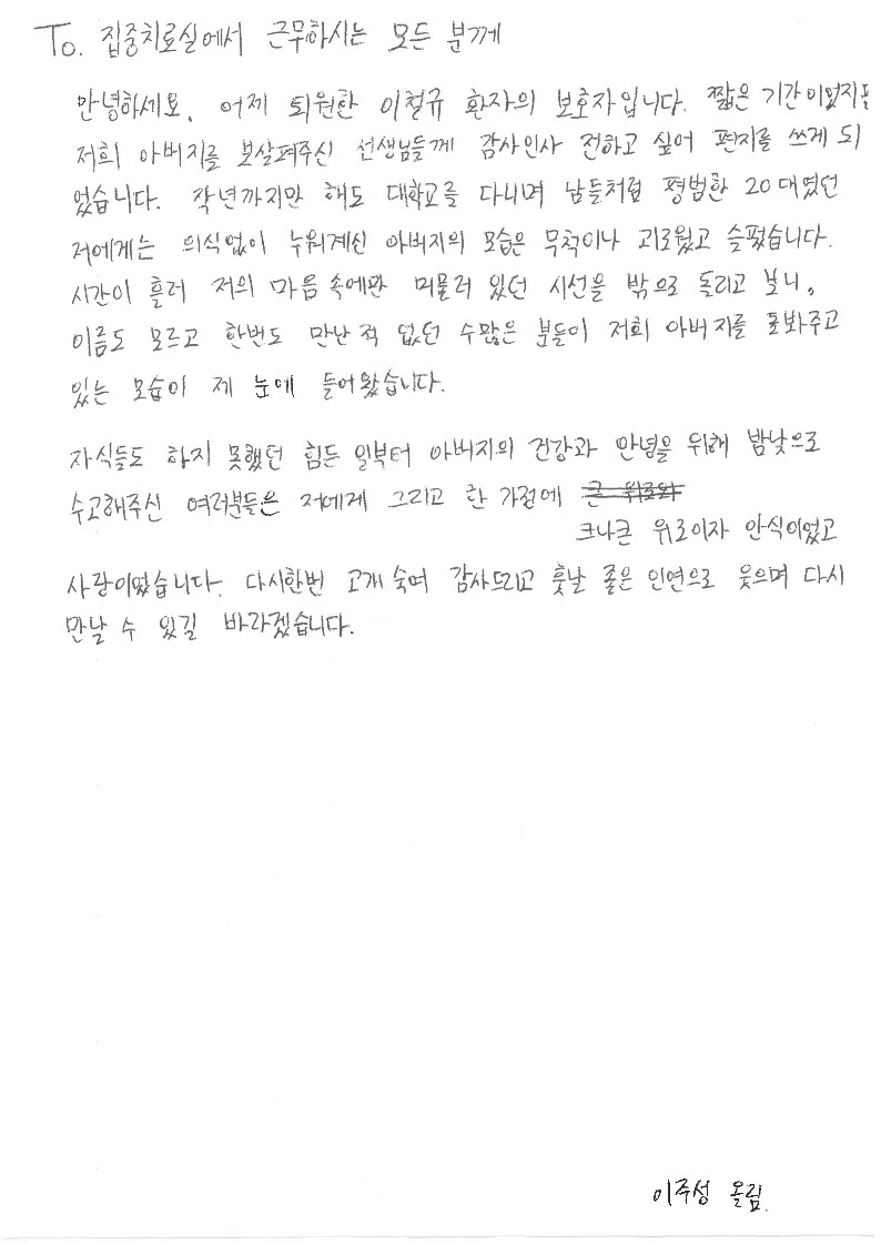 To. 집중치료실에서 근무하시는 모든분께 페이지 정보 작성자 수요양병원 댓글 0건 조회 368회 작성일 25-05-16 10:07 목록 본문 To. 집중치료실에서 근무하시는 모든분께 이전글고객의 소리함 감사합니다. 25.10.10 다음글고객 소리함 (감사합니다.) 25.05.15 댓글 0 댓글목록 등록된 댓글이 없습니다.